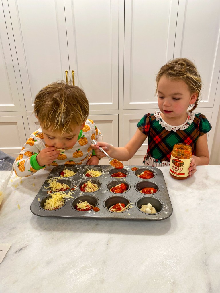Once the dough has risen – it will roughly double in size – press the center down and push the sides up against the muffin tin. Place 1-2 mozzarella balls in each crust, then top with 1 tablespoon of pizza sauce.